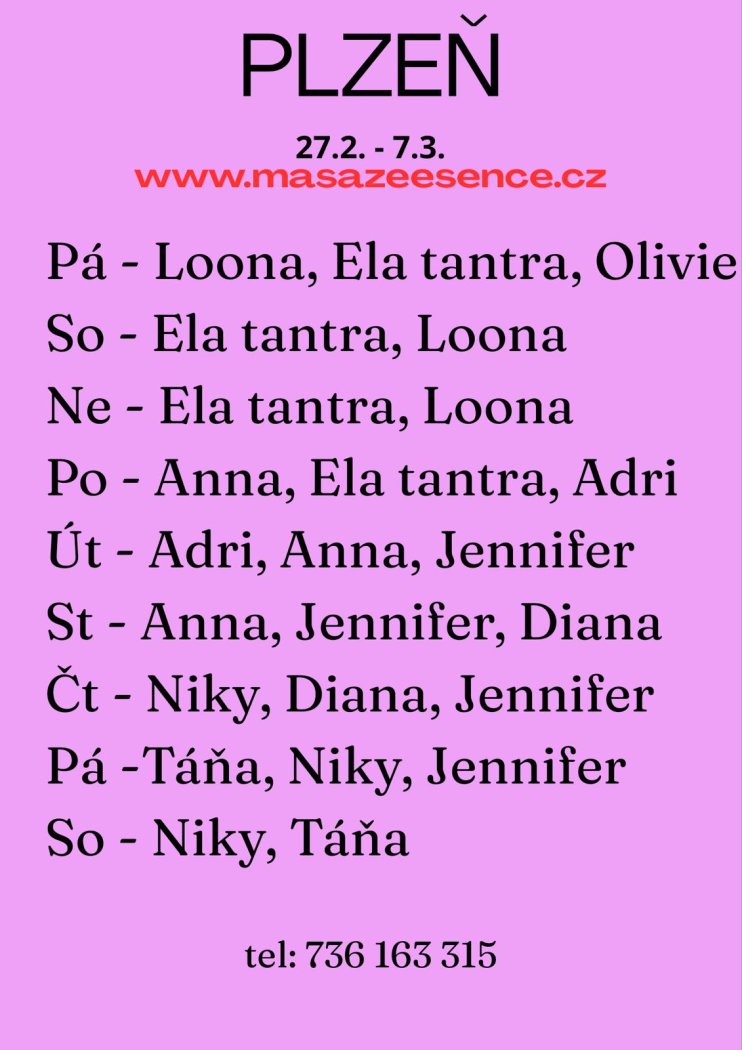Seznamka pro intimní flirt a erotické masáže 💋 Vítám vás v salonu MASÁŽE ESENCE Jsem SMYSLNÁ dívka Diana co vás ráda potěší... JEDNÁ SE O EROTICKOU MASÁŽ S RUČNÍM VYVRCHOLENÍM. Je to velice hravá a intimní masáž do které zapojím nejen své ruce, ale i stehna, zadeček i prsa. Extra masáže: FOOTJOB, KOUPACÍ RITUÁL, ZPĚTNÁ MASÁŽ A DALŠÍ. MASÍRUJI CELÁ NAHÁ. Pro více informací volej: 736 163 315. DOPORUČUJI: délku masáže 60min. a z důvodu hlubšího prožitku 90min.